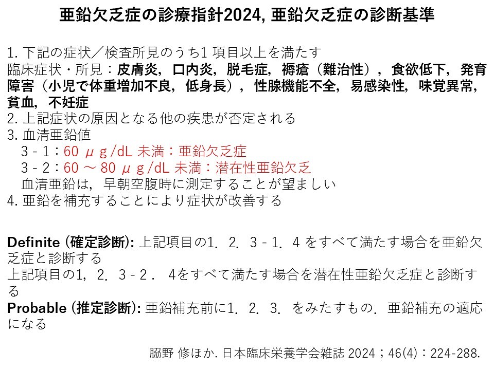 亜鉛欠乏症の診断基準は亜鉛欠乏の診断指針2024によると以下のように定められています。
